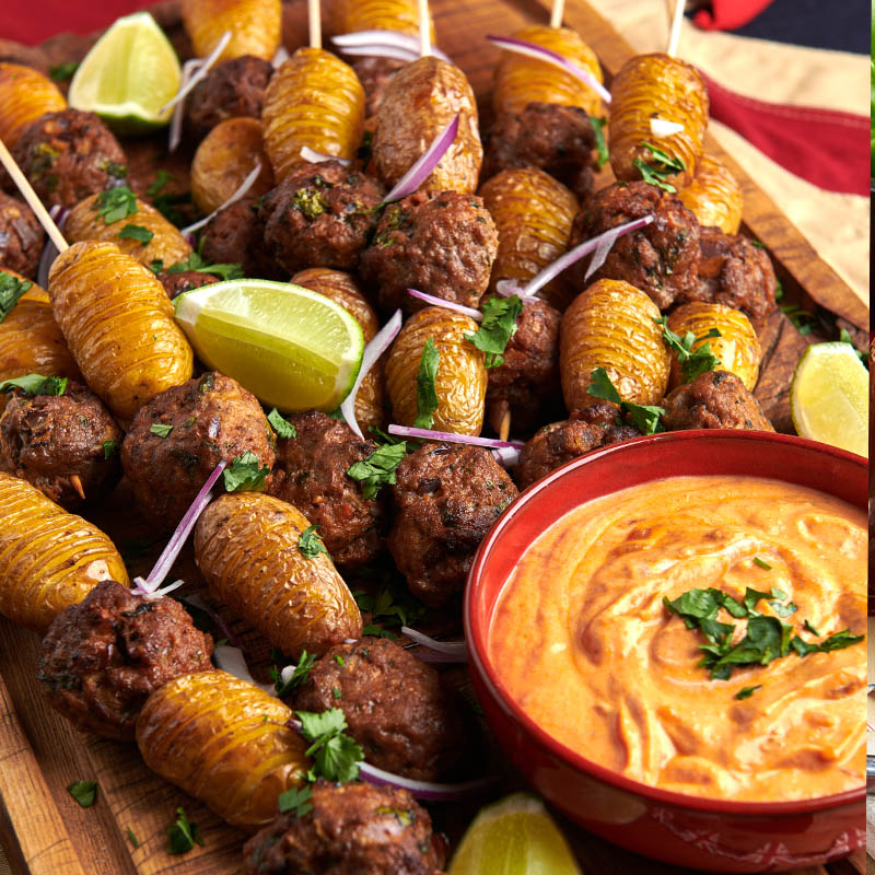 Try out these great lamb and Hasselback potato skewers with a coronation dip, recipe provided by Premier Foods.